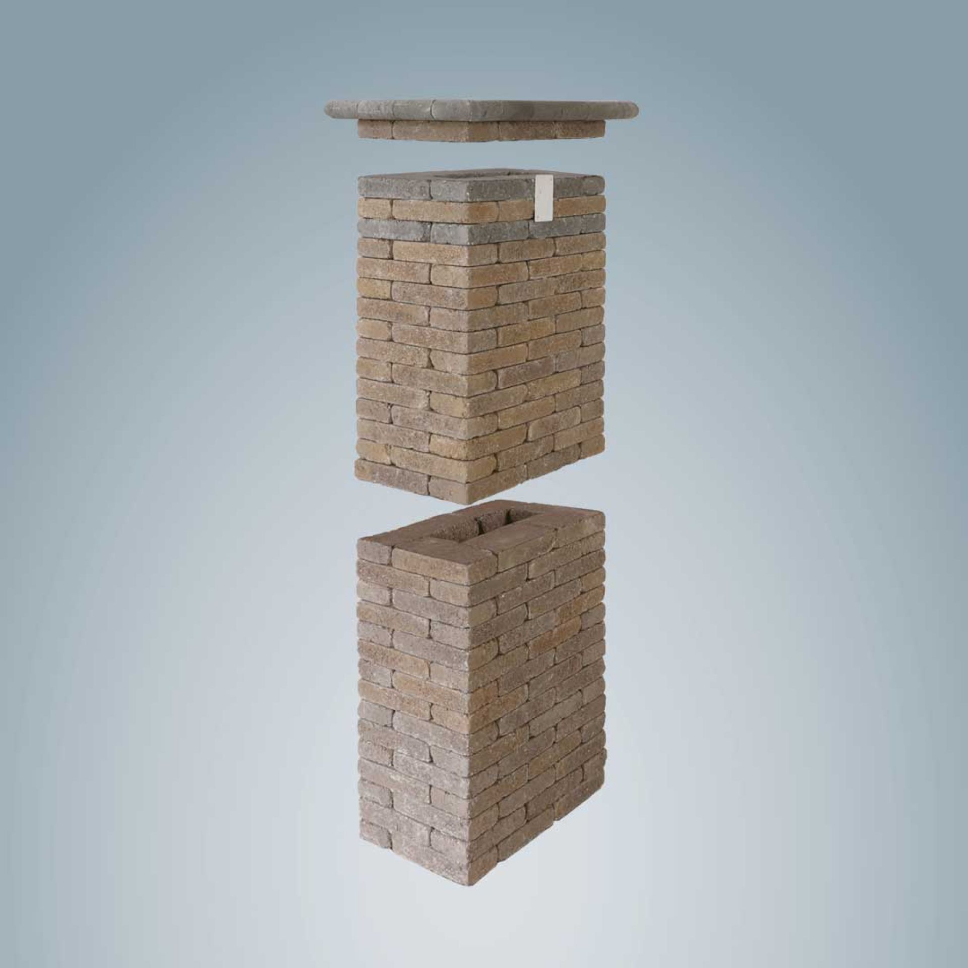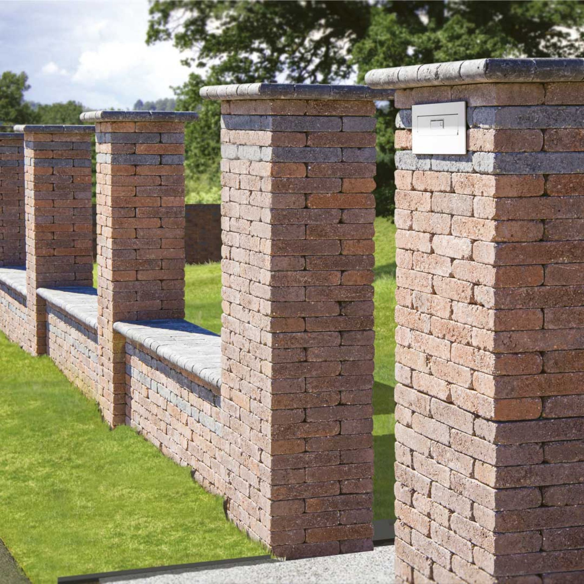 A pillérek fahéj színben, grafit fedlappal és grafit díszcsíkkal rendelhetőek. Ez azt jelenti, hogy a fedlap alatti 2. és 4. sor a fedlappal megegyező színű, grafit színű Téglakőből készül.